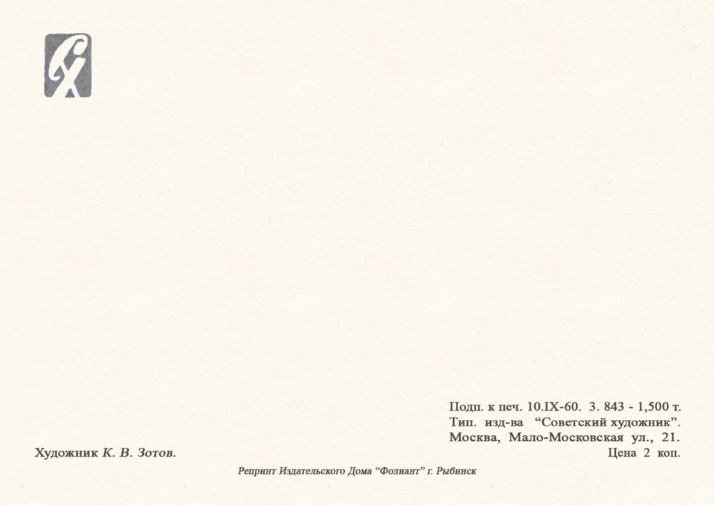 7106 К Зотов 1960 г 30 руб. В корзину Описание Комментарии 0 Описание 10,5 /14,8 см Комментарии 0 Нет комментариев Добавить комментарий