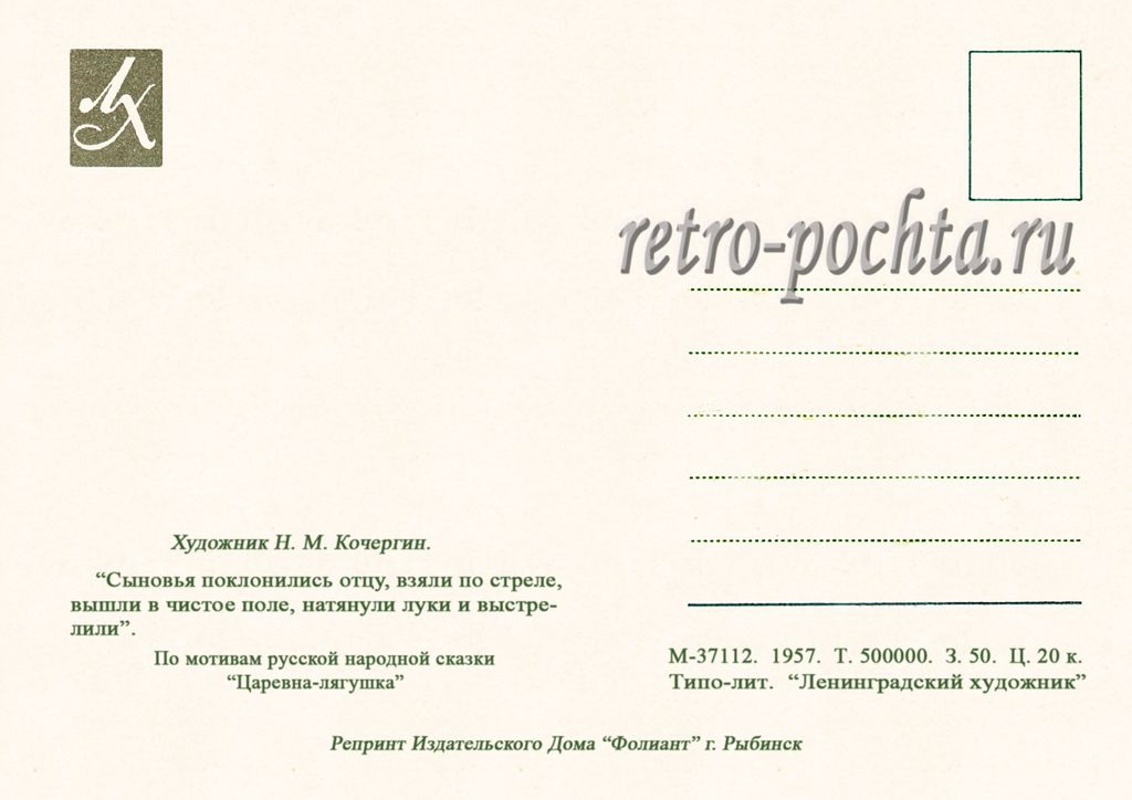 7213 Н Кочергин 1957 Царевна-лягушка 30 руб. В корзину Описание Комментарии 0 Описание Формат открытки 14,8 х 10,5 см Комментарии 0 Нет комментариев Добавить комментарий