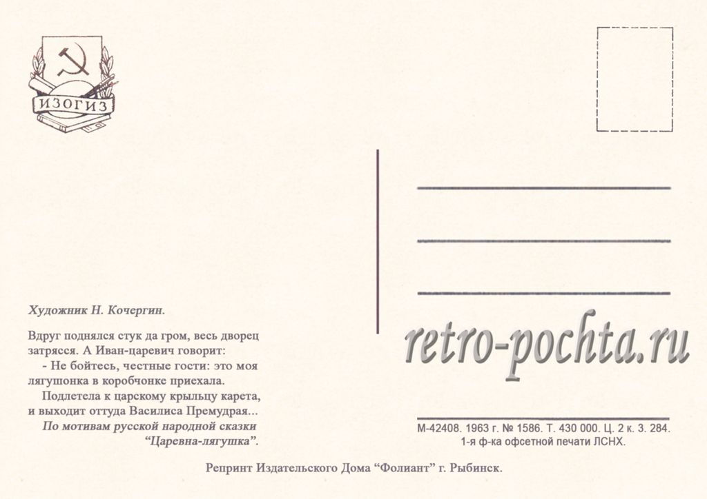 7215 Н Кочергин 1963 Царевна-лягушка 30 руб. В корзину Описание Комментарии 0 Описание Формат открытки 14,8 х 10,5 см Комментарии 0 Нет комментариев Добавить комментарий