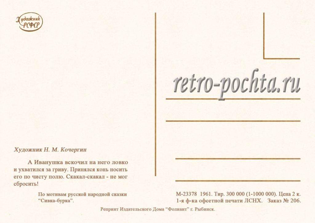 7223 Н Кочергин 1961 Сивка-Бурка 30 руб. В корзину Описание Комментарии 0 Описание Формат открытки 14,8 х 10,5 см Комментарии 0 Нет комментариев Добавить комментарий