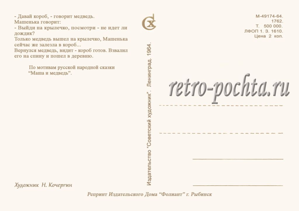 7233 Н Кочергин 1964 Маша и медведь 30 руб. В корзину Описание Комментарии 0 Описание Формат открытки 14,8 х 10,5 см Комментарии 0 Нет комментариев Добавить комментарий