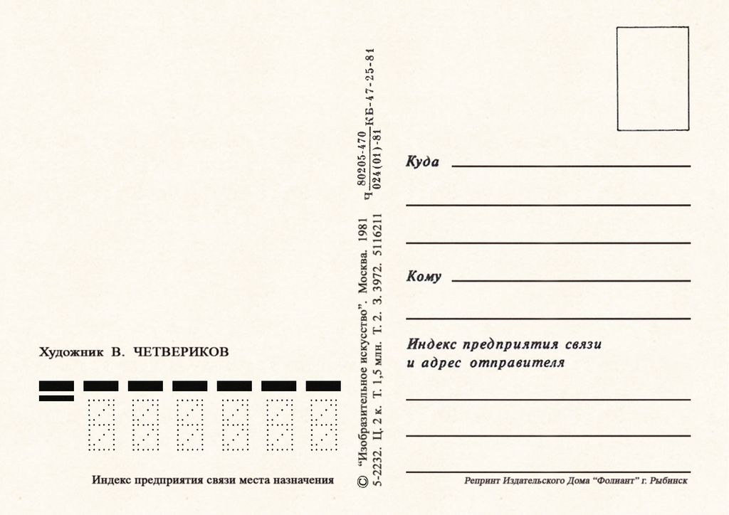 7115 В Четвериков 1981 г 30 руб. В корзину Описание Комментарии 0 Описание Формат открытки 14,8 х 10,5 см Комментарии 0 Нет комментариев Добавить комментарий