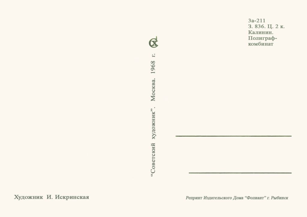 7121 И Искринская 1968 г 30 руб. В корзину Описание Комментарии 0 Описание Формат открытки 10,5 /14,8 см Комментарии 0 Нет комментариев Добавить комментарий