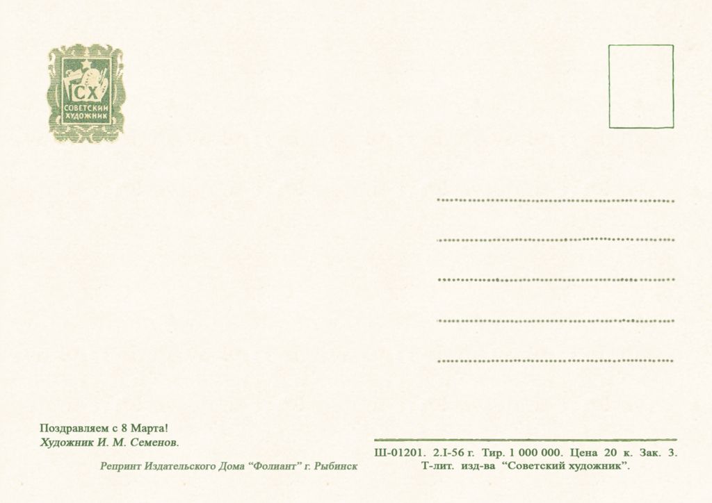 8 марта 1718 И Семёнов 1956 30 руб. В корзину Описание Комментарии 0 Описание Формат открытки 14,8 х 10,5 см Комментарии 0 Нет комментариев Добавить комментарий