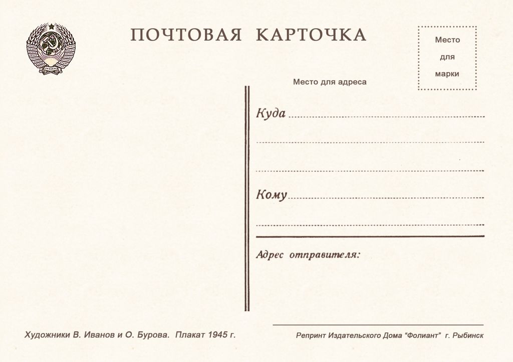7458 В Иванов О Бурова плакат 1945 г 30 руб. В корзину Описание Комментарии 0 Описание Формат открытки 10,5 х 14,8 см Комментарии 0 Нет комментариев Добавить комментарий