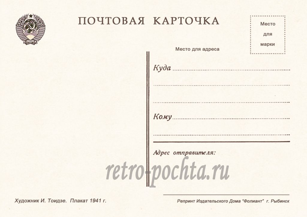 7507 И Тоидзе плакат 1941 г 30 руб. В корзину Описание Комментарии 0 Описание Формат открытки 10,5 х 14,85 см Комментарии 0 Нет комментариев Добавить комментарий