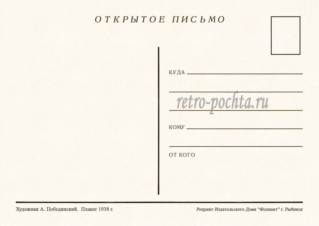 7749 А Побединский плакат 1938 г 30 руб. В корзину Описание Комментарии 0 Описание Формат открытки 10,5 х 14,8 см Комментарии 0 Нет комментариев Добавить комментарий