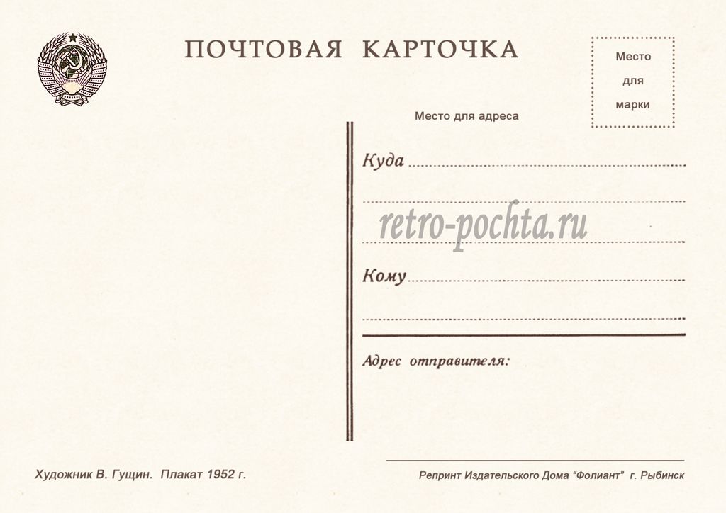 7779 В Гущин плакат 1952 г 30 руб. В корзину Описание Комментарии 0 Описание Формат открытки 10,5 х 14,8 см Комментарии 0 Нет комментариев Добавить комментарий