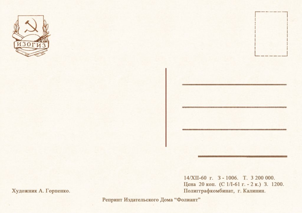 7613 А Горпенко 1960 30 руб. В корзину Описание Комментарии 0 Описание Формат открытки 14,8 х 10,5 см Комментарии 0 Нет комментариев Добавить комментарий