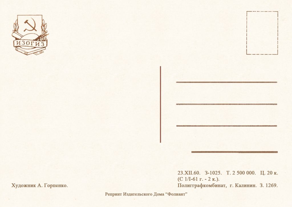 7619 А Горпенко 1960 30 руб. В корзину Описание Комментарии 0 Описание Формат открытки 14,8 х 10,5 см Комментарии 0 Нет комментариев Добавить комментарий
